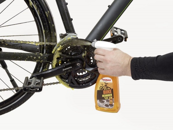Sonax Bike Cleaner, desengraxante biodegradável desenvolvido para limpeza de bicicletas e ciclo motores que dissolve resíduos de óleos, graxa e seiva de árvores.